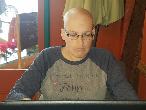 | Me, hard at work, writing at the local coffee shop. Thanks for all those Ko-fis! |